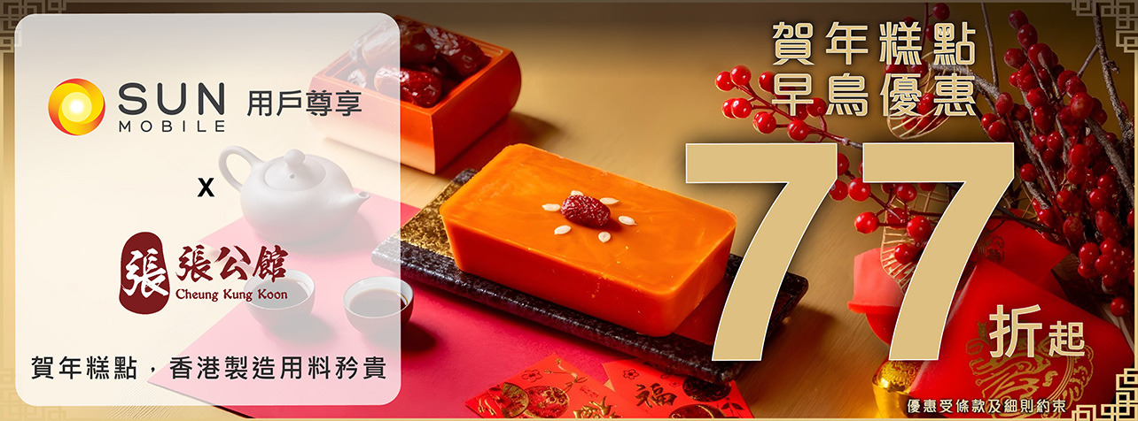 農曆新年即將來臨,又到了時候置辦年糕、賀年食品及新年禮盒了!張公館延續傳統繼續為您呈獻兩款極上賀年糕點,每款用料矜貴,香港製造盡顯手藝。更可選擇「尊貴賀年禮盒」,豪華豐盛,盤滿缽滿,新年時節,一家人品嚐或摯送親友皆宜。SUN Mobile 用戶更享額外優惠,讓大家可以做足準備,迎接馬年。