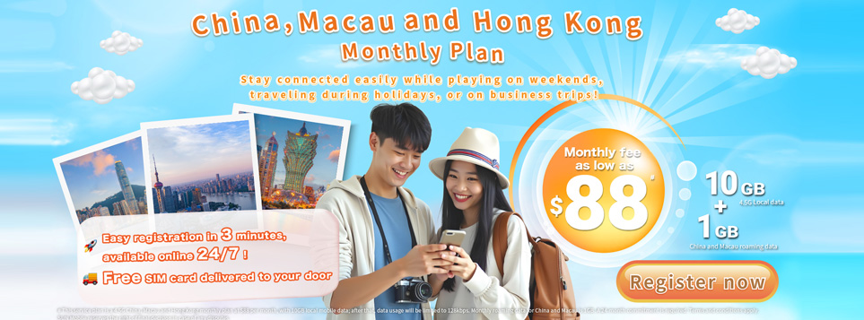 Includes 10GB high-speed local data and 1GB China & Macau roaming data. Wide coverage, easy connection. Register now and enjoy a worry-free internet experience!